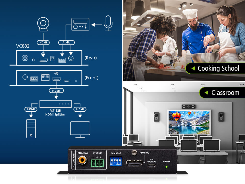 Enhance your viewing experience with the VC882 by simplifying audio embedding for monitoring and recording in settings such as training rooms and classrooms.