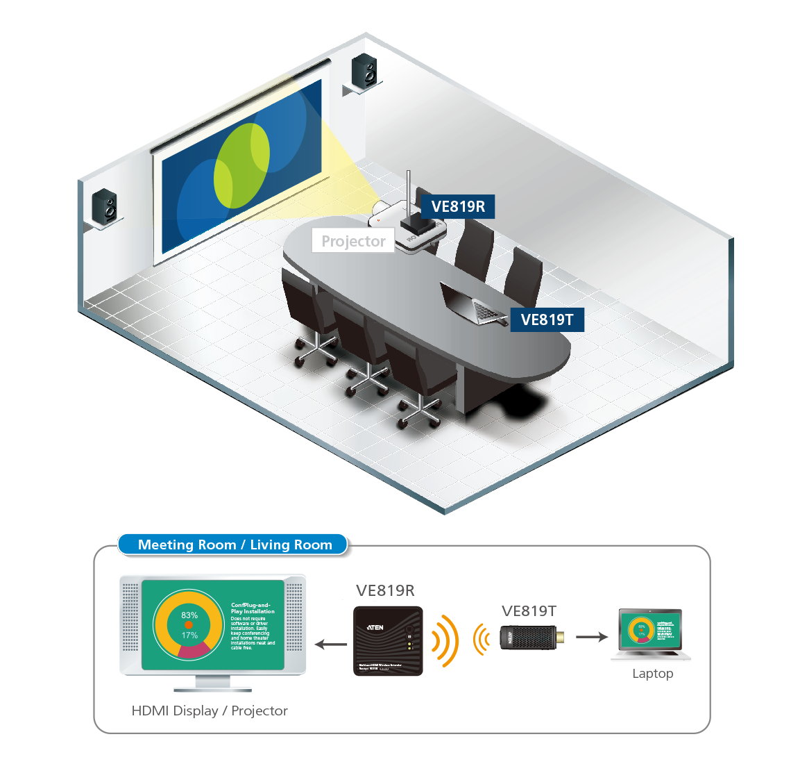 The VE819 HDMI Dongle Wireless Extender is the perfect solution for meeting rooms and home theater systems. It sends uncompressed Full HD 1080p signal from your HDMI devices such as laptops, computers and set top boxes. Up to four Wireless HDMI Transmitters can be paired to the Receiver, boosting the number of total transmitters per receiver to a maximum of 4.