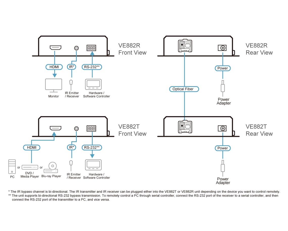 • Extends the transmission range of HDMI, IR and RS-232 signals using one fiber optic cable