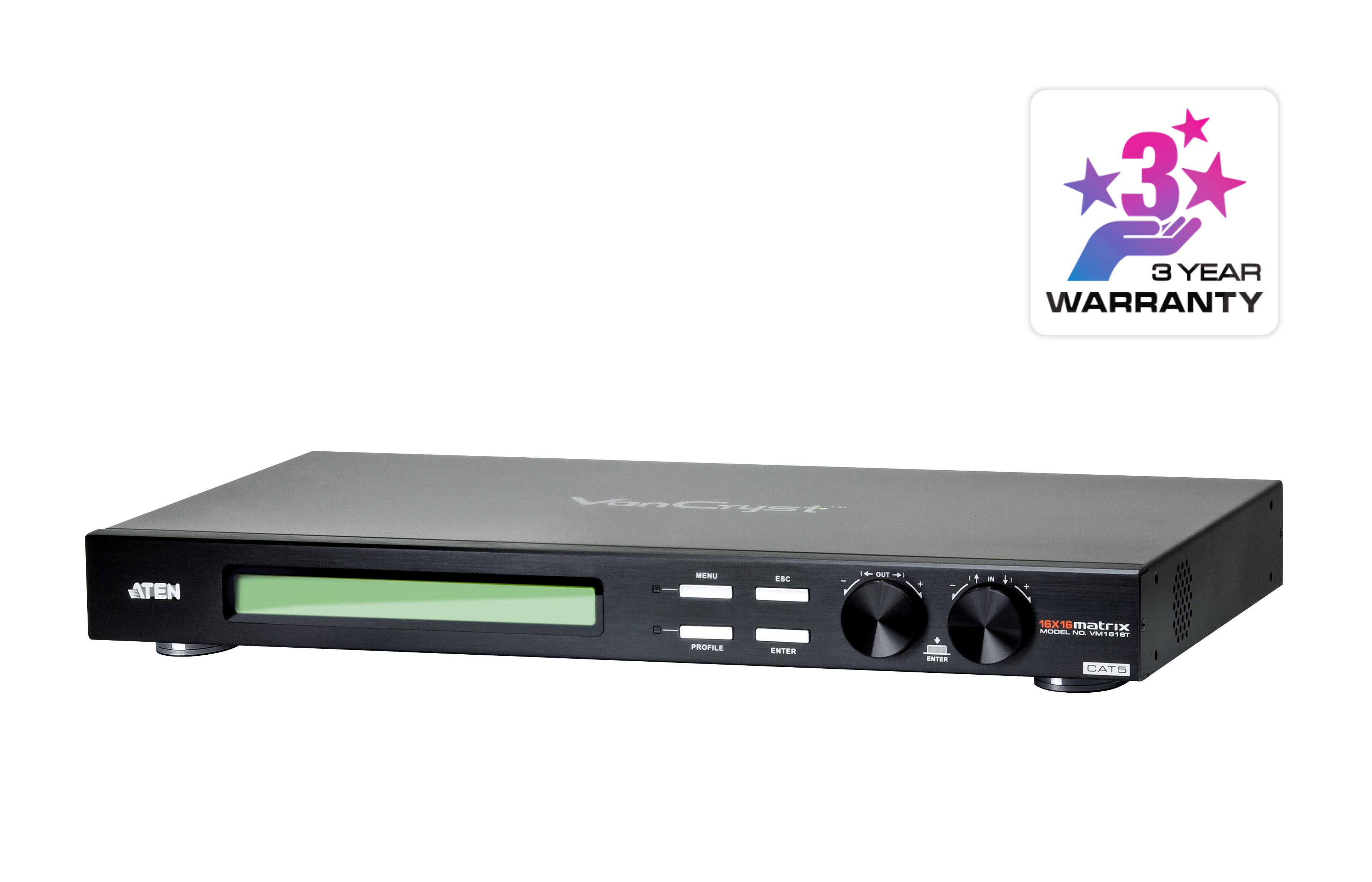 The VanCryst™ Media Matrix Solution is a combination of the VM1616T 16 x 16 Cat 5 A/V Matrix Switch and the VE500/VE300 A/V Over Cat 5 Extender. The VM1616T is a Matrix Switch that uses VE500/VE300 extenders to route and distribute audio, video and RS-232 signals over distances of up to 300 meters with 1920 x 1200 video resolutions.