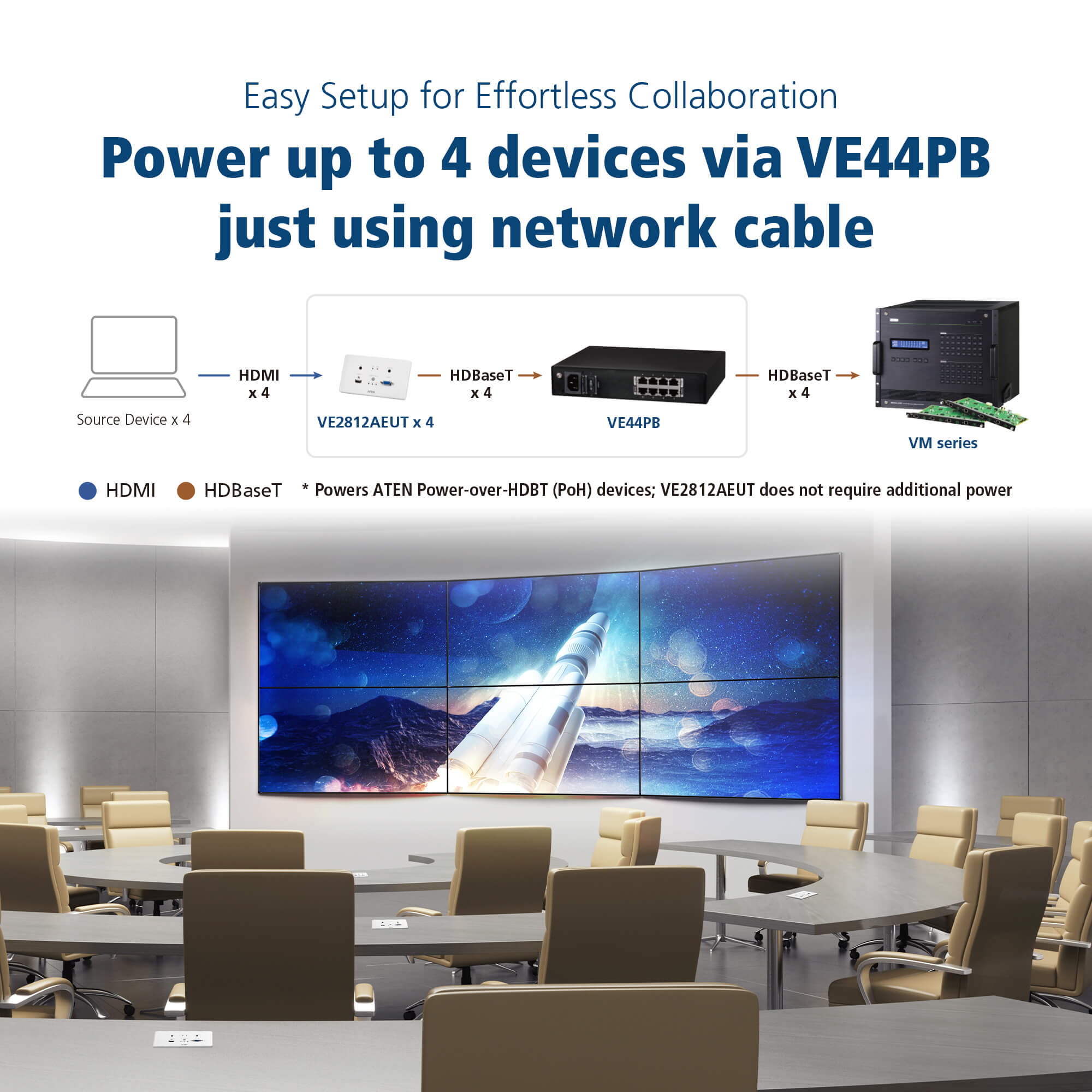 • Enables power supply via HDBaseT with installation of I/O boards and power injectors (VE44PB recommended), eliminating the need for separately installing power infrastructures to save overall cost