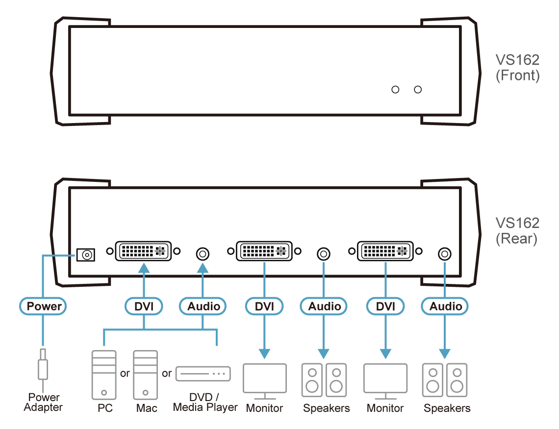 VS162 Video Splitter provides DVI video and audio input signals to 2 DVI video and audio outputs after duplication and boosting. They are ideal for any type of broadcasting environment, classrooms, or by power computer users.
