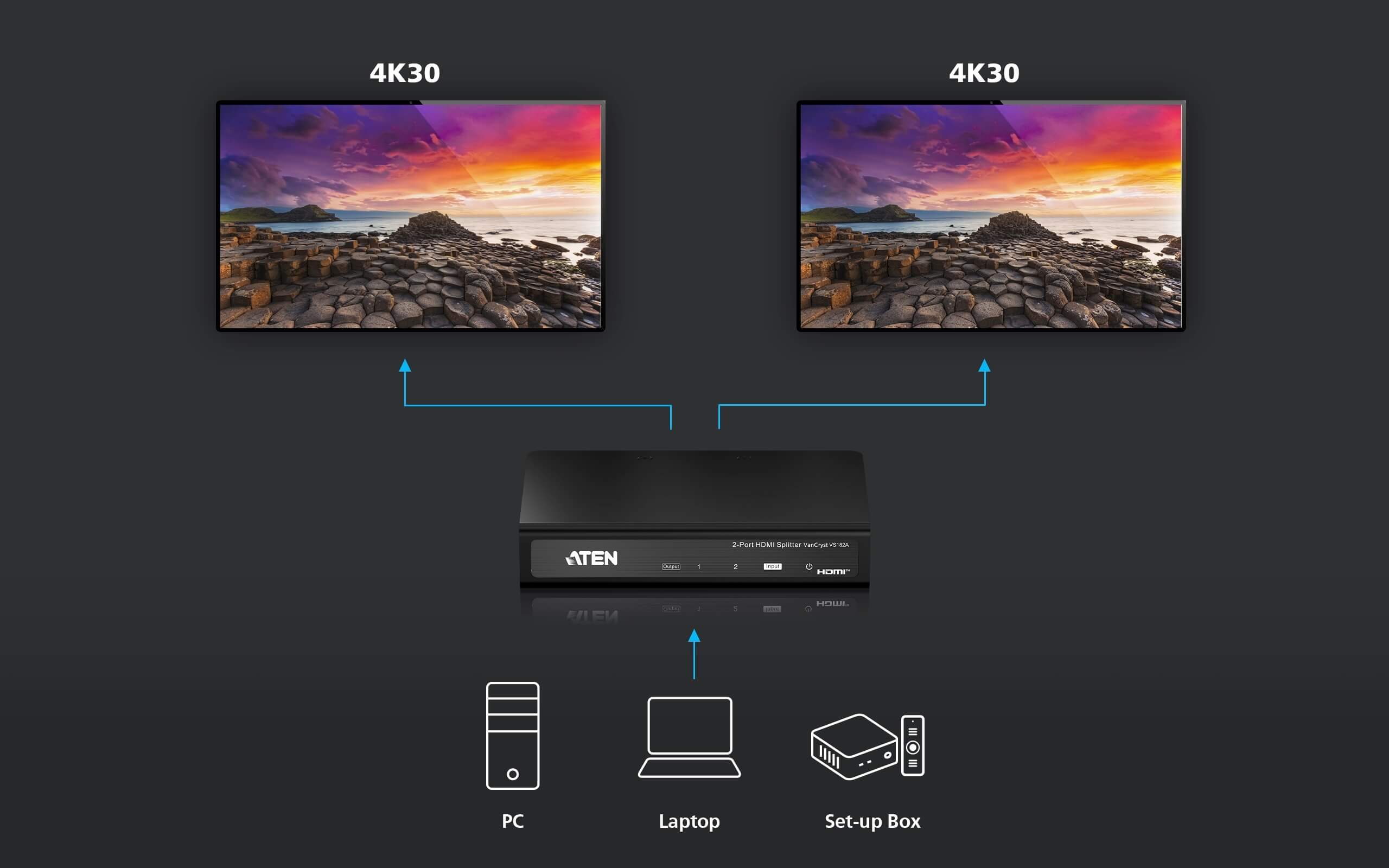 - Connects one HDMI source to two HDMI displays at the same time