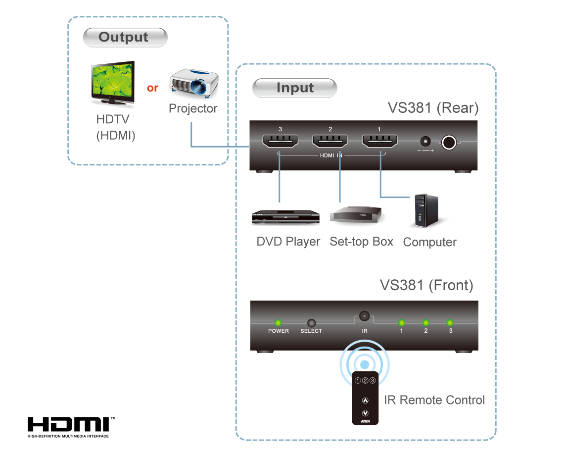 - Allows up to three HDMI A/V sources to be connected to one HDMI display