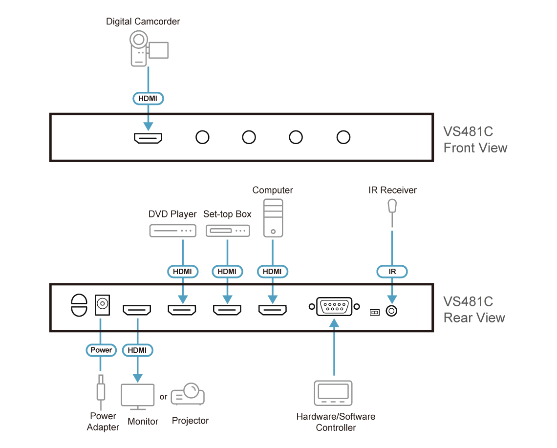 - 1x VS481C 4-Port True 4K HDMI Switch