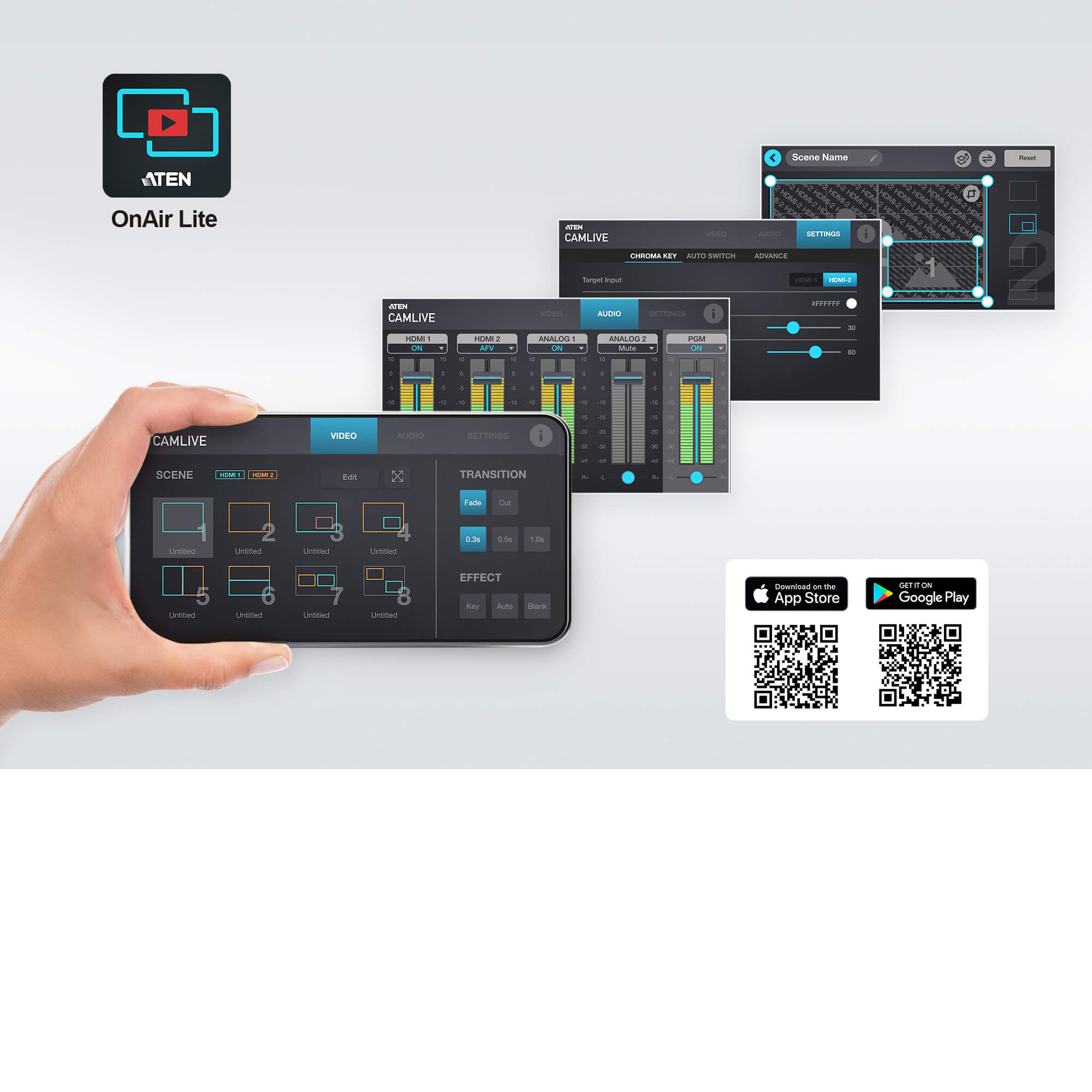 The ATEN OnAir Lite control app allows for controlling remotely, editing in real-time, chroma keying, and arranging multi-elements into your program mix. You can switch and mix video/audio, change settings and effects, and save up to 8 scene presets for quick switching. Upcoming new features will include command shortcuts for chats, animations, and sound effects, all to help streamline your workflow.