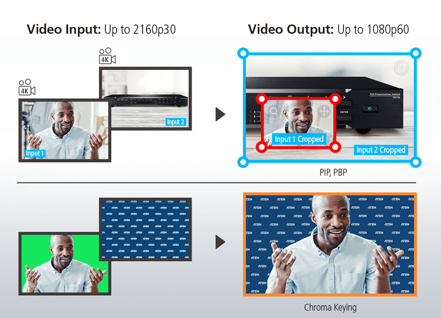 - Multi-Crop function with 4K resolution input capability, users can crop multiple images from the connected HDMI inputs, resize and insert them into different scenes