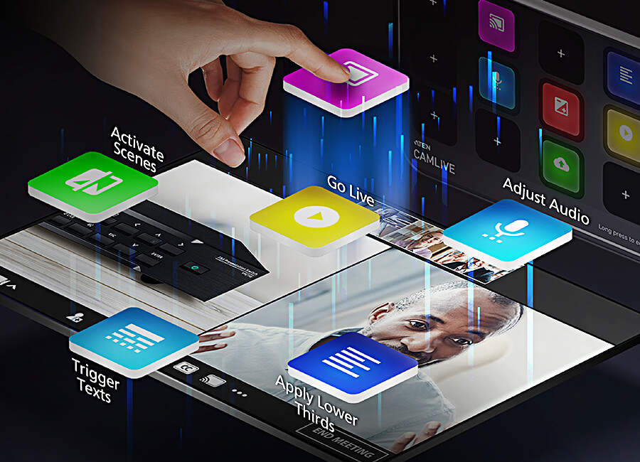 The CAMLIVE™ PRO works with the intuitive ATEN OnAir Lite app, which helps place everything you will need to customize the video stream right at your fingertips, as well as allows you to combine, crop, and scale video to make amazing PnP layouts. Users can preset up to eight custom scenes and manage audio sources through the intuitive touch panel interface for a superior pro-level finish. The adoption of chroma key technique enables users to replace the background with another content for eye-popping effects.