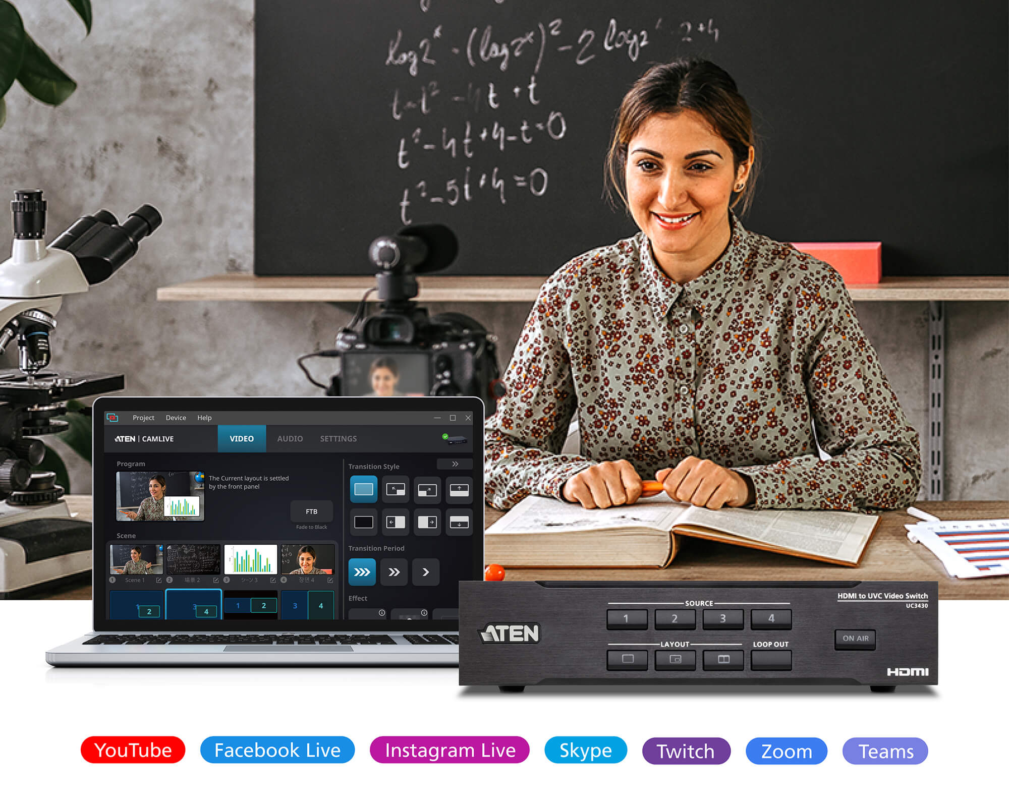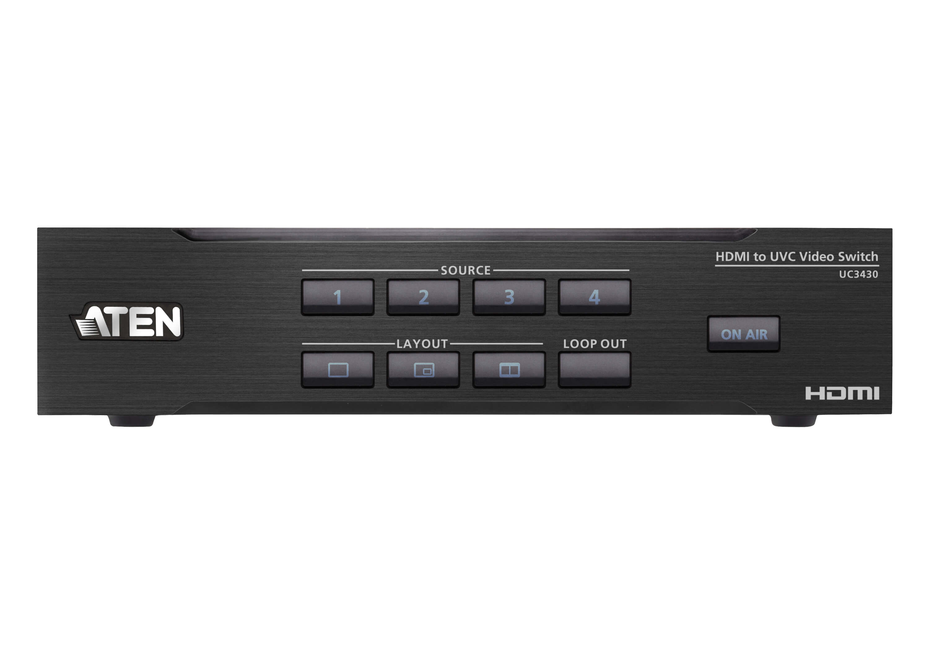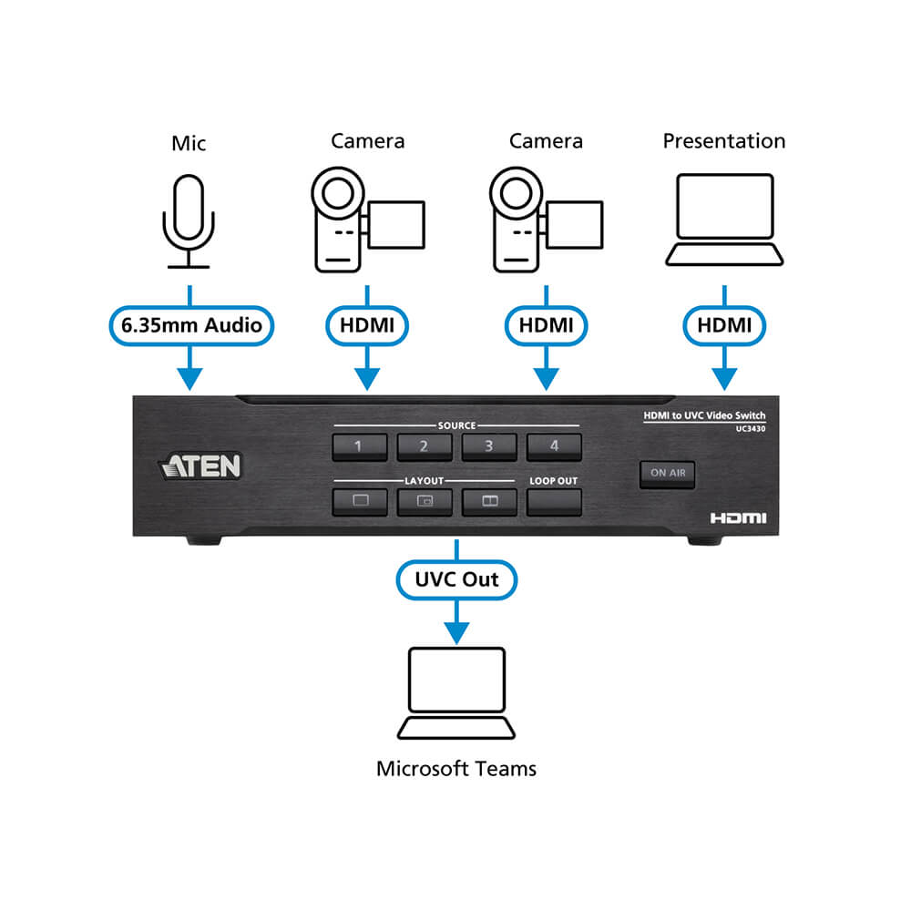 - ATEN OnAir Lite app – users can remotely control device settings in real-time, including multiple AV source switching / mixing, content cropping / resizing, layout options (full screen / PiP / PbP / PoP), transitions, Chroma Key, and logo adding