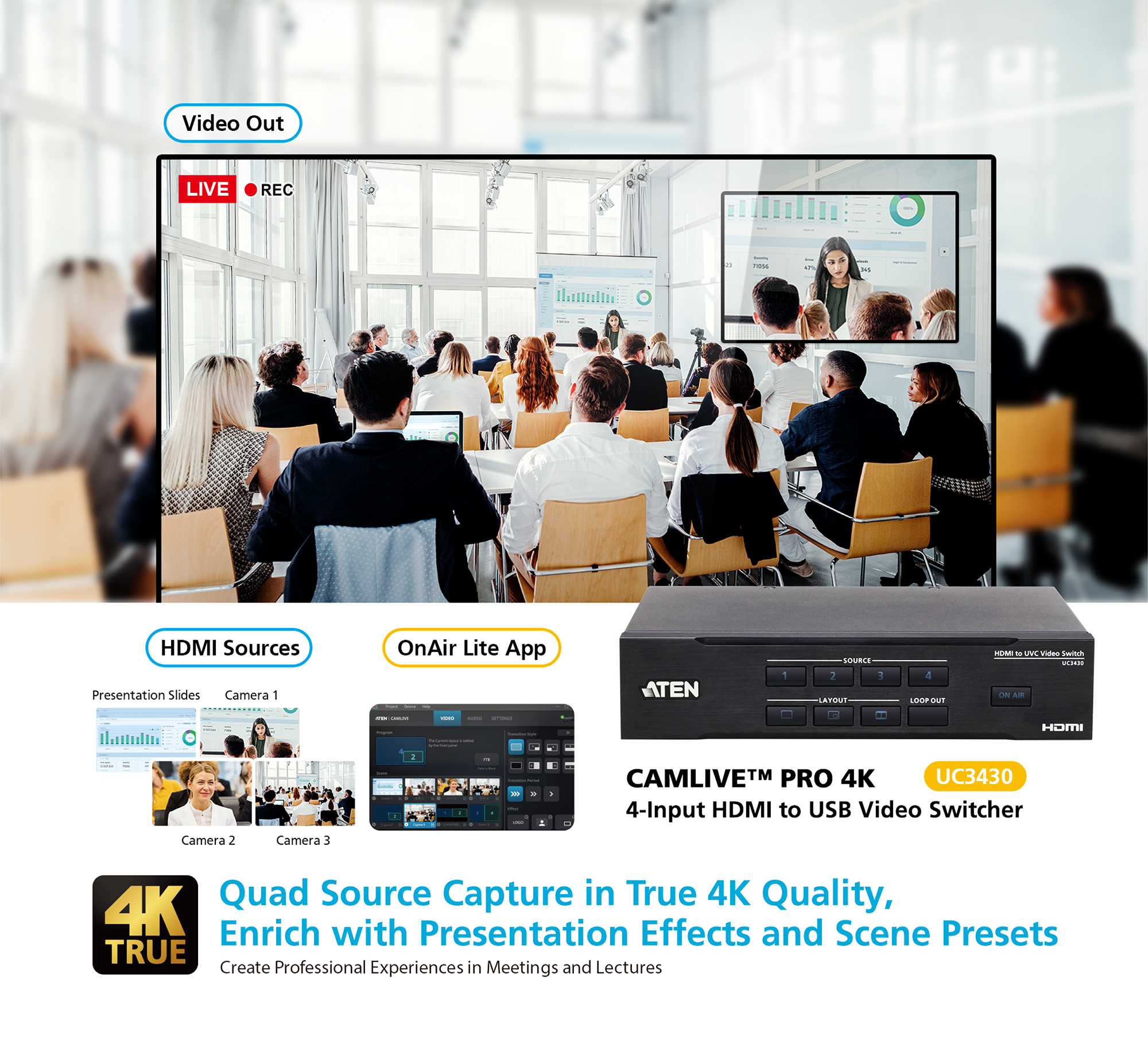 – USB-C output 4K @ 30 for live broadcast on the Internet - Versatile control methods via the front panel pushbuttons, RJ-45 port for serial control via ATEN VK Control System, and ATEN OnAir Lite app