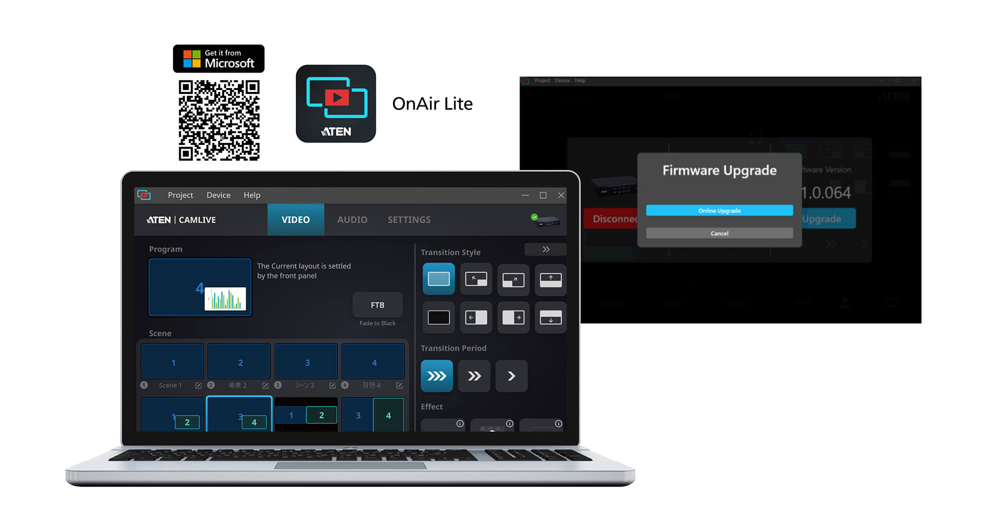 The ATEN OnAir Lite control app allows for controlling, editing in real-time, chroma keying, and arranging multi-elements into your program mix. You can switch and mix video/audio change settings and effects, and save up to 8 scene presets for quick switching. The new version of ATEN OnAir Lite also allows you to upgrade the firmware online. Simply plug the USB cable into the PC from CAMLIVE™ PRO 4K, connect the network to the PC, open the OnAir Lite app, and click the device logo to initiate the upgrade.