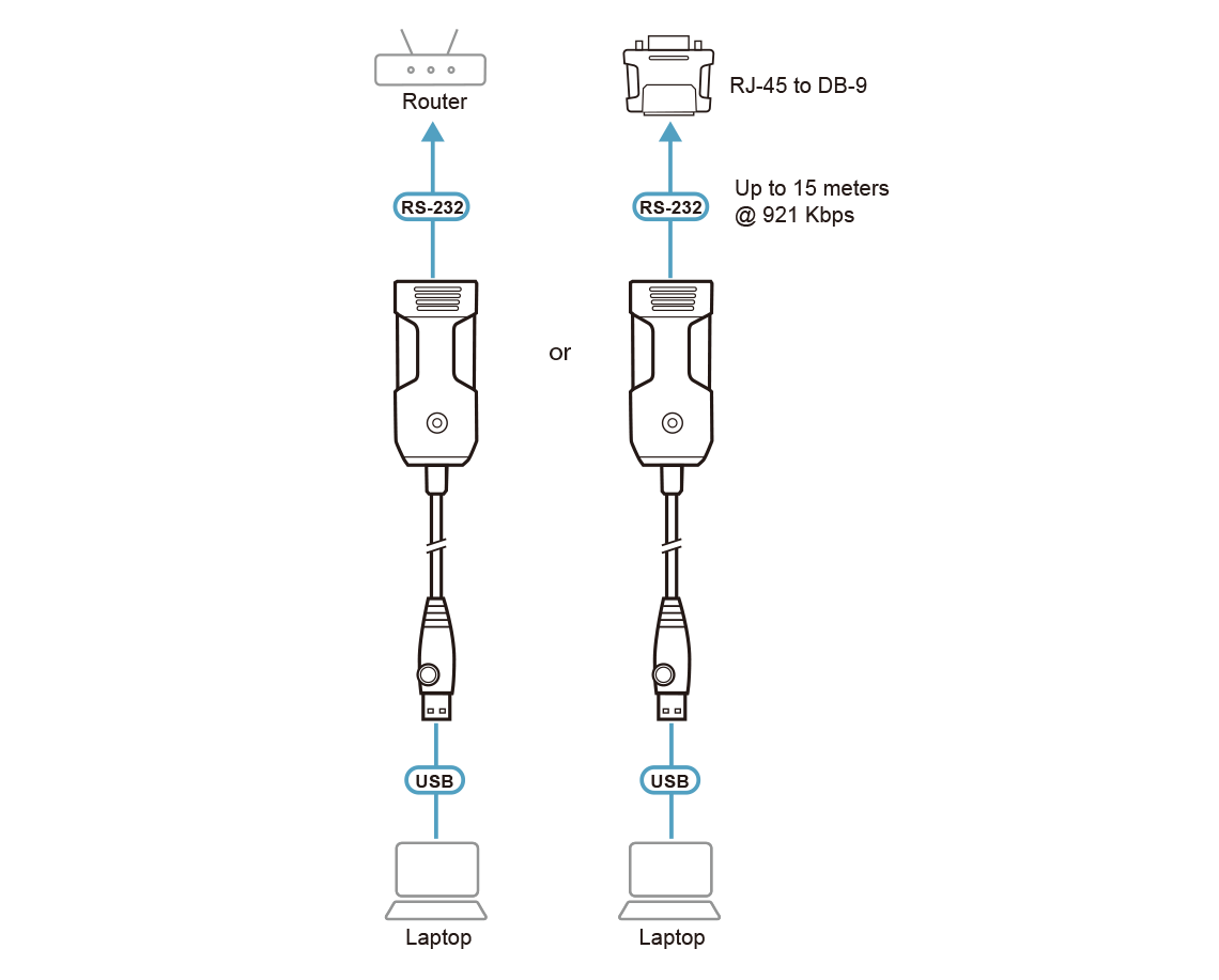 - Converts a USB port to RJ-45 Console port (RS-232)