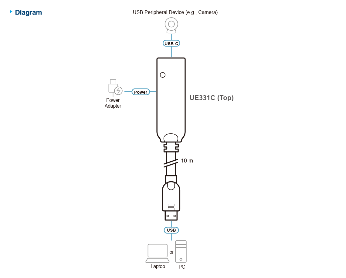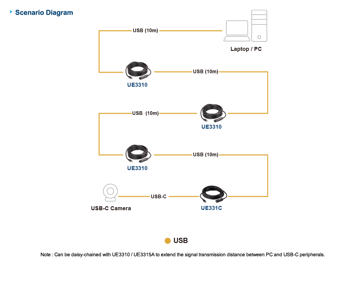 - Extends the USB signal from a USB Type-A PC / laptop to a USB-C device 10 m away