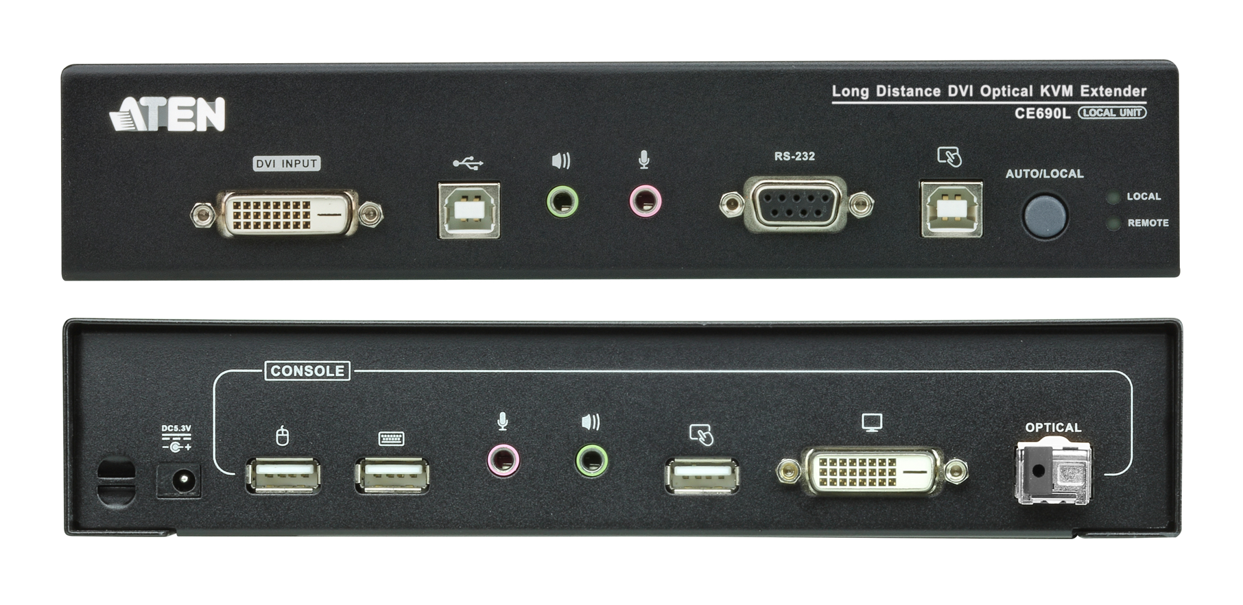 The ATEN CE690 USB DVI Optical KVM Extender extends uncompressed DVI video @ 1920 x 1200 and USB / RS-232 control signals at distances up to 20km (single-mode).