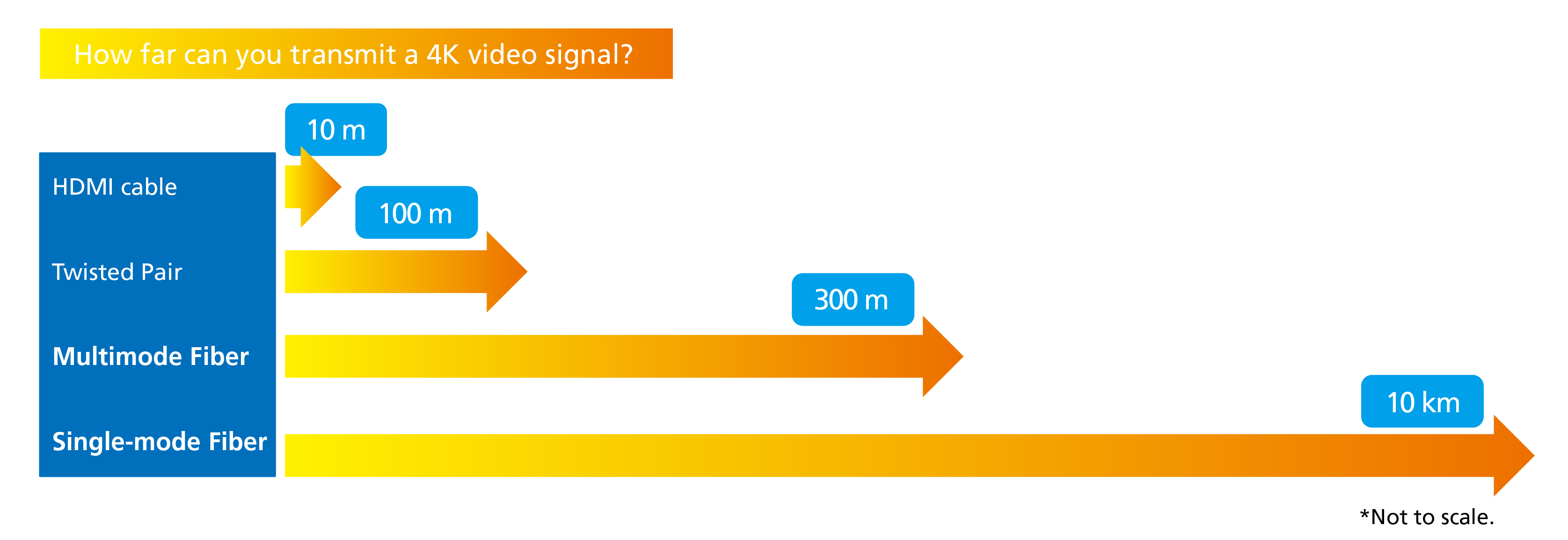 The graphic above shows how far the same 4K HDMI signal (4K@30p with a bandwidth of 9 Gbps) can be sent over various cable types.