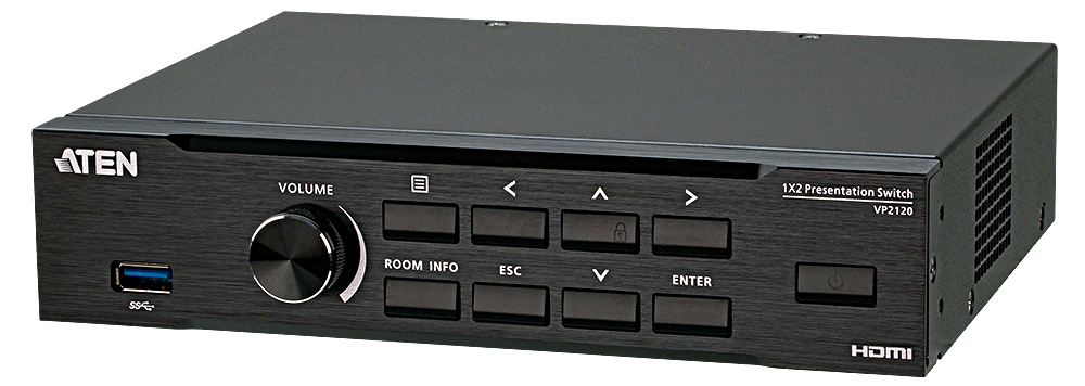 The ATEN VP2120 Seamless Presentation Switch with Quad View Multistreaming integrates a video matrix switch, AV streaming, audio mixing, and collaborative functions into one compact device.