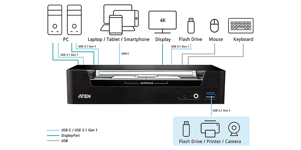 Docking stations: https://ru.aten.com/global/en/products/usb-&-thunderbolt/docking-stations/
