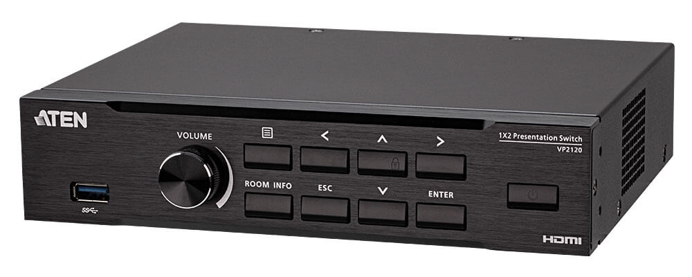The Seamless Presentation Switch with Quad View Multistreaming (VP2120) integrates video matrix switch, AV streaming, audio mixing, and collaborative functions into one compact device.