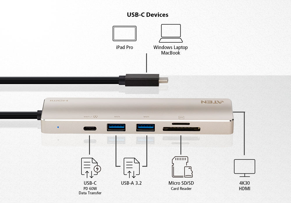 The ATEN UH3239 6-in-1 USB-C Multiport Mini Dock with Power Pass-Through offers numerous essential ports yet is small and light enough to take on-the-go anywhere.
