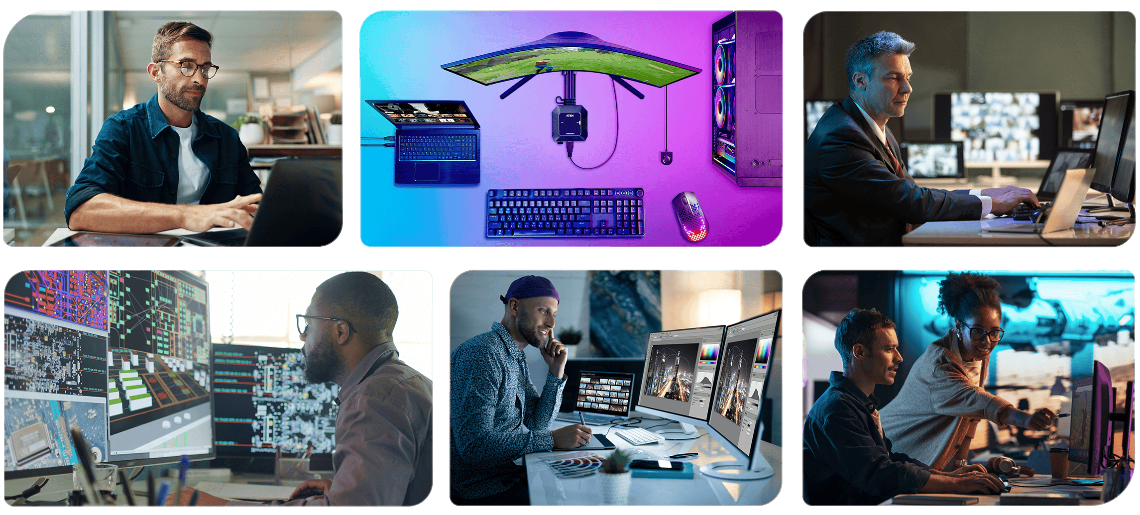 ATEN’s comprehensive range of desktop KVM switches, USB switchers, and USB hubs is designed to help you manage multiple systems, peripherals, and workflows—using a single, intuitive setup. This guide showcases the ideal connectivity solutions for various workstation environments based on work setting, performance needs, and security requirements. So you can get more done, with less friction.