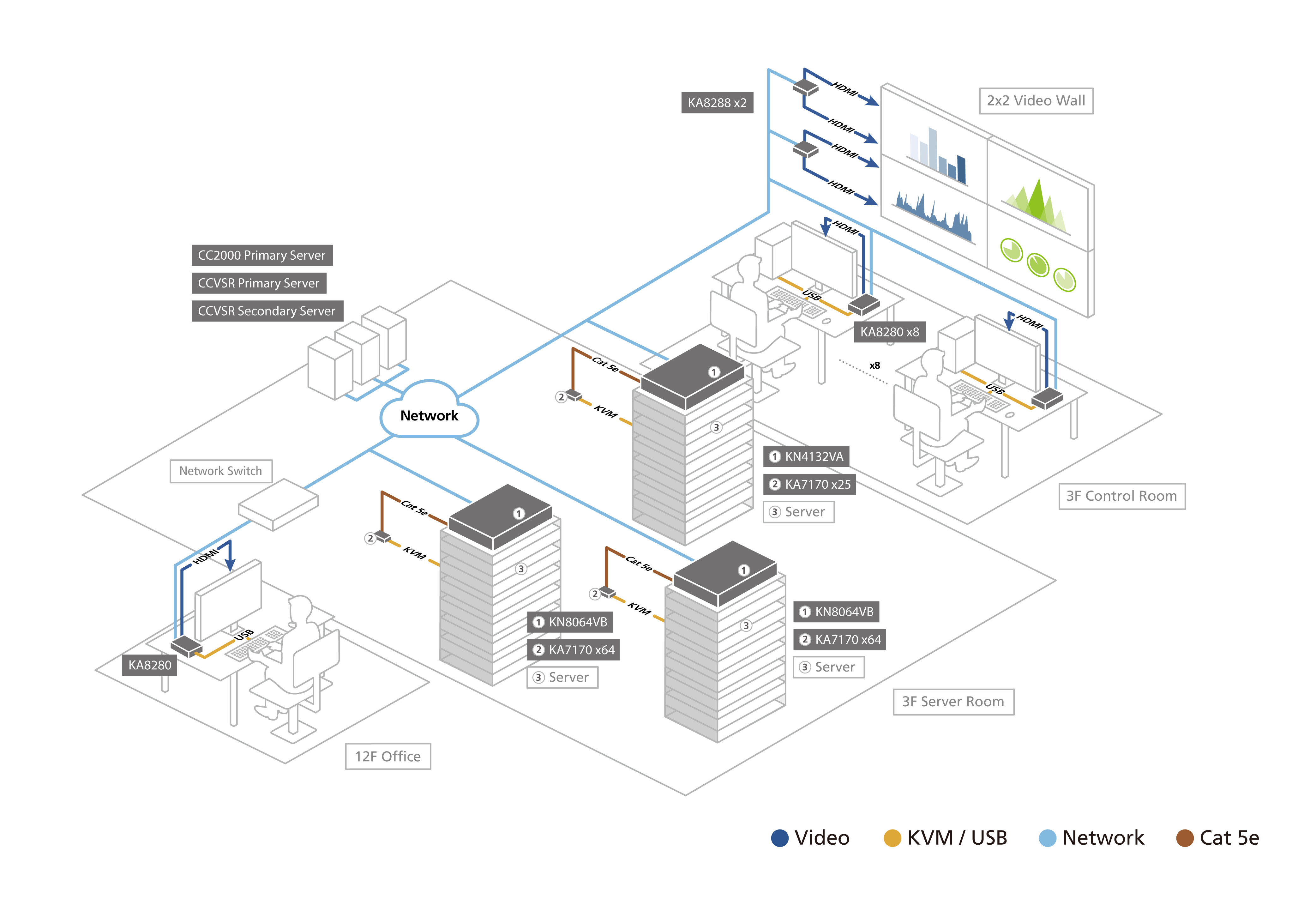• The ATEN over IP server management solution can be accessed and managed via CC2000 software, making it efficient for operators to control servers centrally via a single portal, while also permitting simultaneous monitoring of video output for surveillance, power, and environment monitoring via video walls located in control rooms on both floors. It provides flexibility and installation simplicity along with strengthened data security while critical information visualization and communication capabilities increase work efficiency and productivity. For extra security, user sessions are recorded.