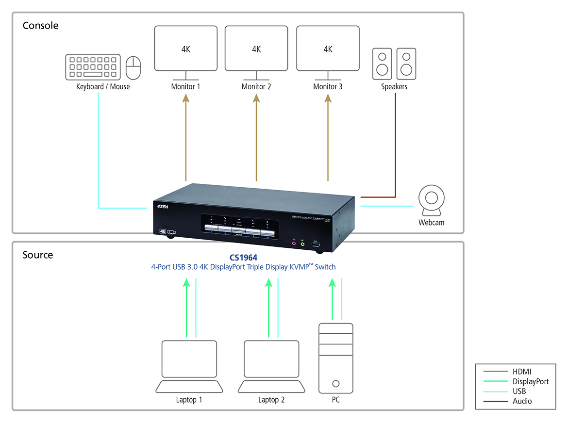 A software development company in Germany was in need of a desktop solution that allows for efficient switching between multiple computers and 4K monitors as well as sharing a webcam and sound system. The software developer’s workspace usually consists of multiple computers (PC or laptop or both), monitors, and peripherals for multitasking purposes, and switching between different operating systems to do programming, testing, and communication is also required. Intos Electronic AG, a renowned German manufacturer and distributor of EDP accessories with a special focus on cables, recommended the software development company adopt the ATEN CS1964 4-port 4K DisplayPort Triple Display KVMP.