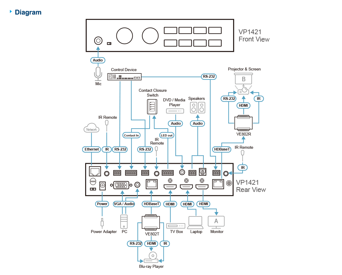 Grazie al controllo semplificato tramite pulsanti sul pannello frontale, telecomando IR, RS-232 e interfaccia grafica utente basata sul web tramite Ethernet, il VP1421 non solo riduce il numero di dispositivi di sistema, ma anche la complessità operativa. È adatto a tutti gli spazi per riunioni e ambienti educativi, come sale riunioni, aule, aule di formazione o qualsiasi altra impostazione di presentazione, come in gallerie espositive o hotel.