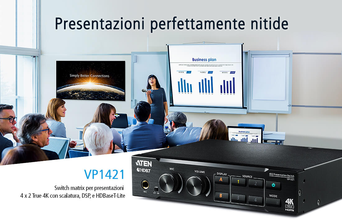 Il VP1421 è uno switch completo per presentazioni che integra una matrice video, scaler True 4K, estensore HDBaseT, DSP audio, e funzioni di conversione da analogico a digitale in un singolo alloggiamento compatto, ideale per sale riunione e spazi didattici.