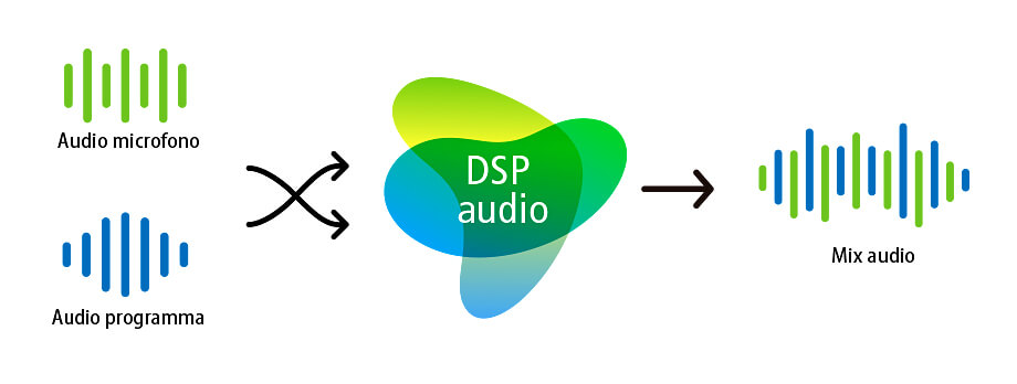 - Riduce automaticamente l'audio del programma quando viene rilevato il segnale microfono