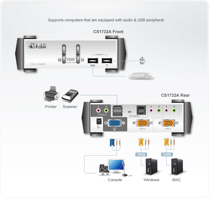 Lo switch KVM a 2 porte CS1732A dispone di una porta USB sul pannello anteriore e una su quello posteriore e di connettori audio. Constente di controllare facilmente i computer e le periferiche da una singola console.