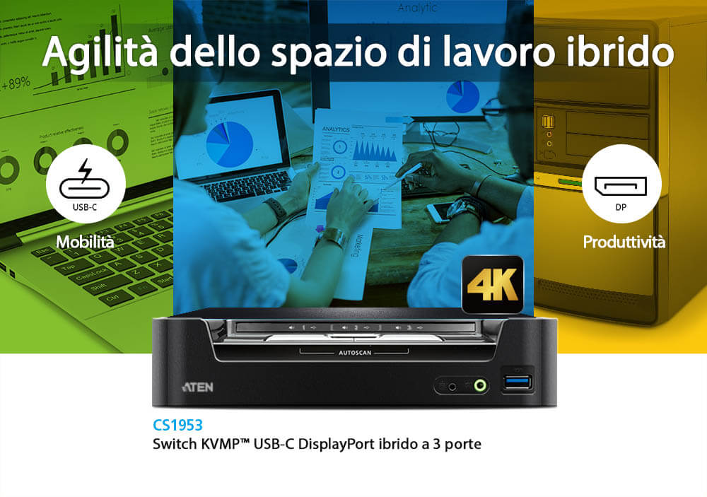 Il CS1953 migliora la sempre più diffusa interfaccia USB-C per semplificare il collegamento plug-n-play verso i dispositivi mobile (laptop, tablet, smartphone) senza dover usare una docking station, rendendolo ideale per l'ottimizzazione dello spazio di lavoro sulla scrivania e un risparmio in termini di costi.