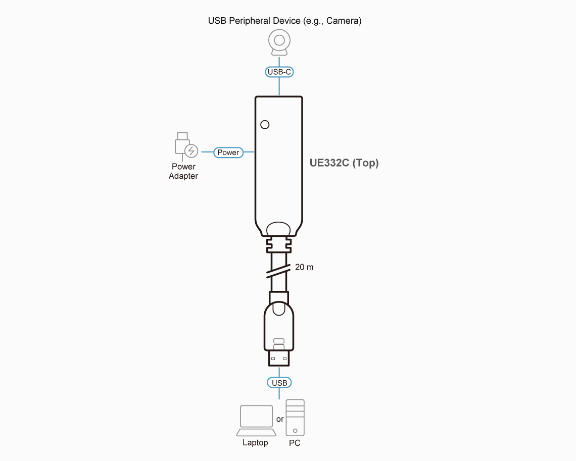 L'UE332C è un cavo extender USB 3.2 Gen 1 che consente di aggiungere 20 m alla connessione tra un PC/laptop abilitato all'USB Tipo A e un dispositivo USB-C. Con il supporto di velocità di trasferimento dati super fino a 5 Gbps, l'UE332C è retrocompatibile con gli standard USB 2.0 e 1.1, garantendo una comunicazione dati affidabile.