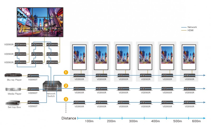 本製品は、トランスミッター(VE8900T/VE8950T)とレシーバー(VE8900R/VE8950R)から構成され、LANでのアクセスが可能な環境であれば、延長距離の制限はありません。トランスミッターとレシーバーを任意に組み合わせて、映像の延長・分配・ビデオウォール表示ができます。さらにスケーラーを搭載しているので、4Kと1080p解像度のディスプレイを混在させることも可能です。したがって、適切な場所に、必要な台数のディスプレイを設置して、訴求力の高い魅力的なサイネージが構築できます。