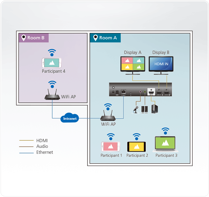 VP2120を使用すると、参加者はノートパソコン、タブレット、およびスマートフォンからワイヤレスで会議に参加できます。そのため、モバイルデバイスからの連携が非常にスピーディーで簡単に行えます。コンテンツ共有は、Web GUIまたはApple/Android対応の制御アプリから、手軽な操作で実行できます。本製品の使用で、あらゆる形態の小規模グループ・ディスカッションを促進し、短時間でのチームワーク強化が期待できます。