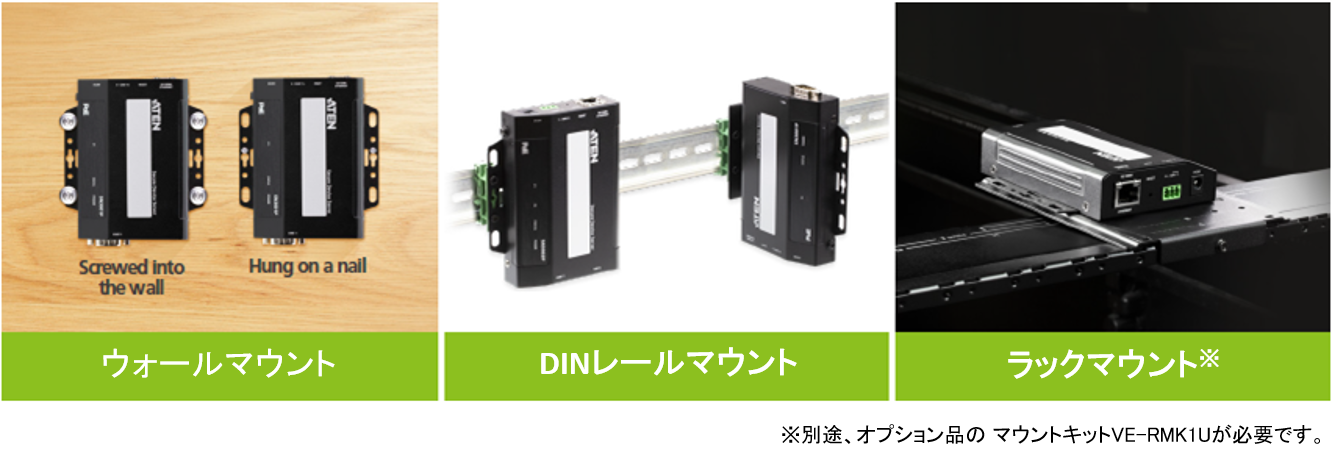 様々な設置環境に対応できるよう、壁掛け、DINレール、ラックなどの取り付けに対応しており、