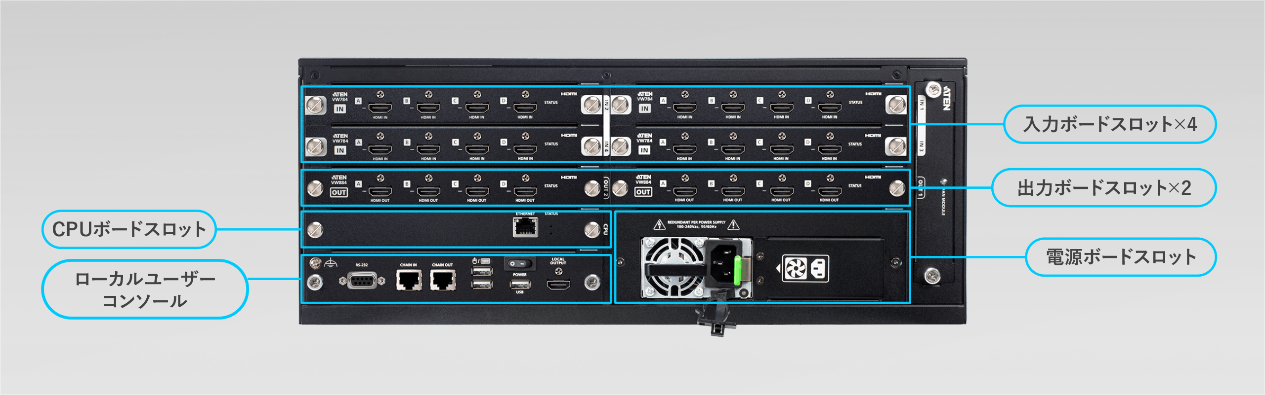 VW1608の4Uシャーシには、入力ボード×4スロットと出力ボード×2スロットを搭載。最大16入力/ 8出力に対応し、将来的な拡張やアップグレードも容易です。冗長電源モジュールとホットスワップ対応冷却ファンにより、高い可用性と安定稼働を実現します。