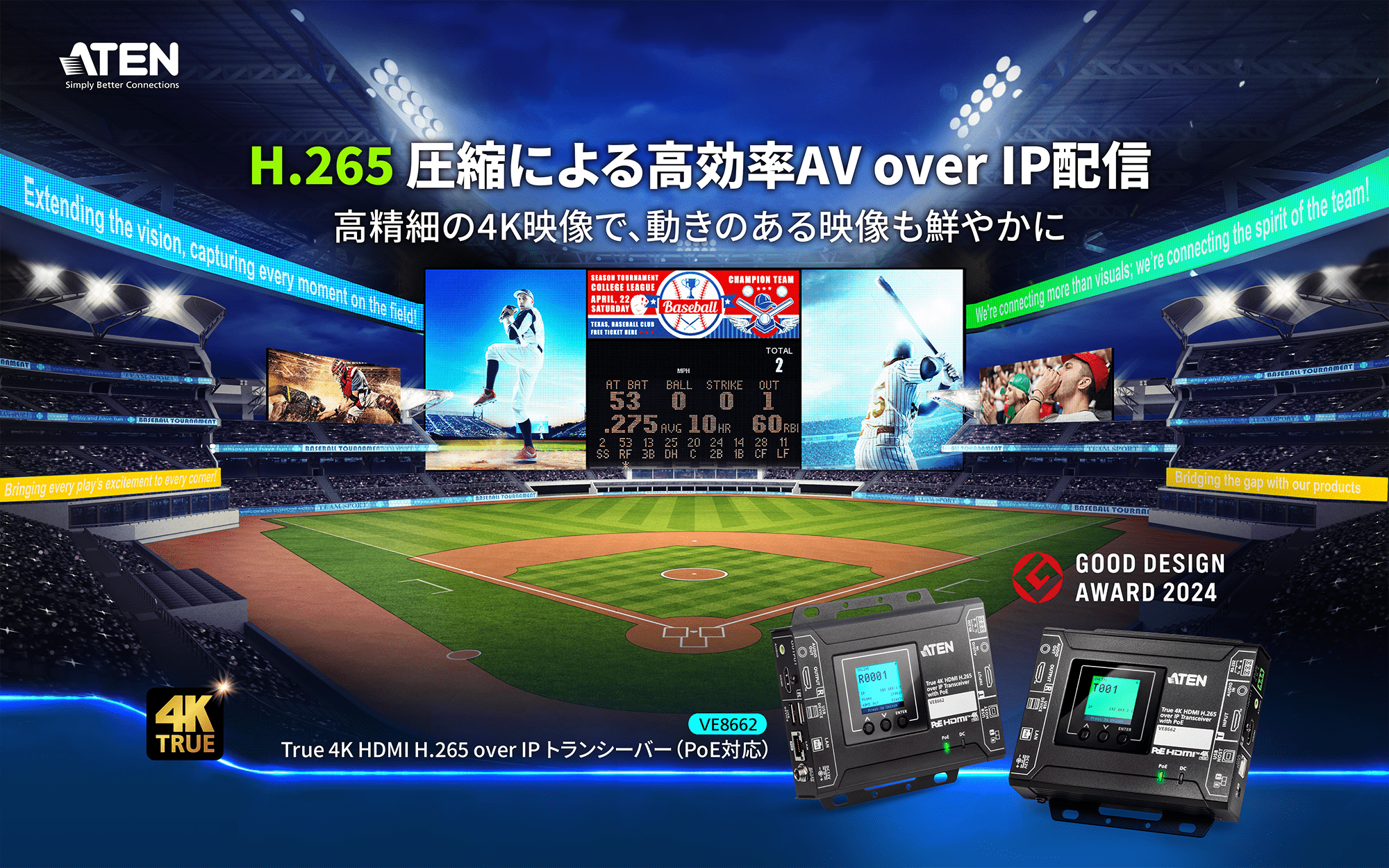 H.265コーデックによる高圧縮・低遅延伝送のほか、PoE対応によりアダプターレスでの運用も可能な柔軟性に優れており、映像伝送における課題解決や効率の良いAV over IPシステムの構築が可能なVideo over IP製品となっております。
