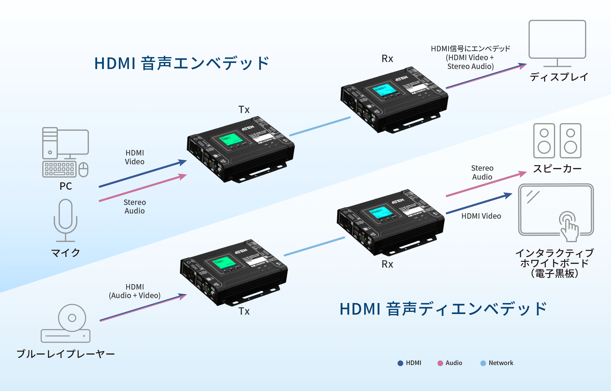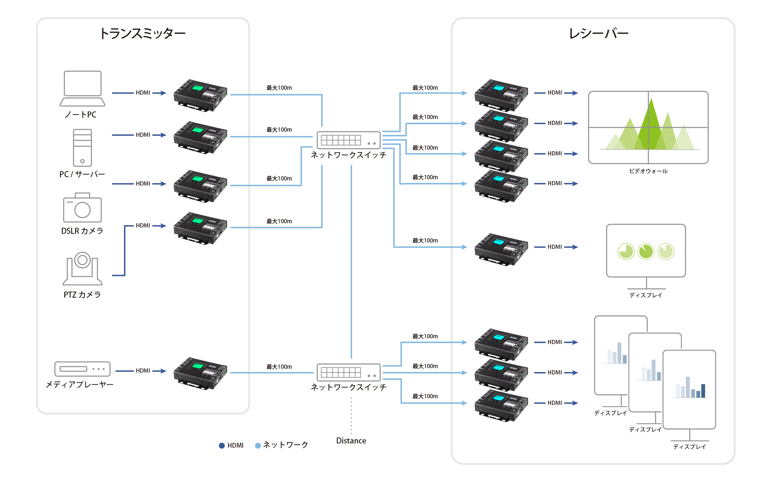 注意:ネットワークアーキテクチャーに関する問題が発生した場合は、「ATEN HDMI over IPビデオエクステンダー システム実装ガイド(PDF/英語版)」を参照するか、ATEN販売代理店にお問い合わせください。