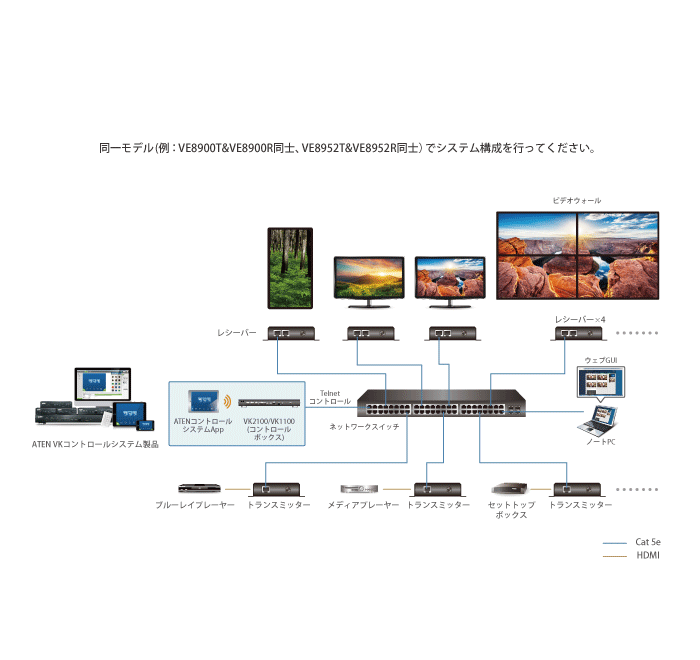 - LANを介した1対1、1対多、多対1、多対多通信に対応しているため、距離を気にすることなく、映像機器の拡張設置が可能
