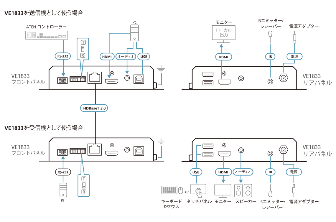 - 1本のCat6aケーブルで、HDMIビデオ(4K60p)、アナログステレオオーディオ(3.5mmライン入力)、電源、USB 2.0、IR/RS-232制御信号を伝送
