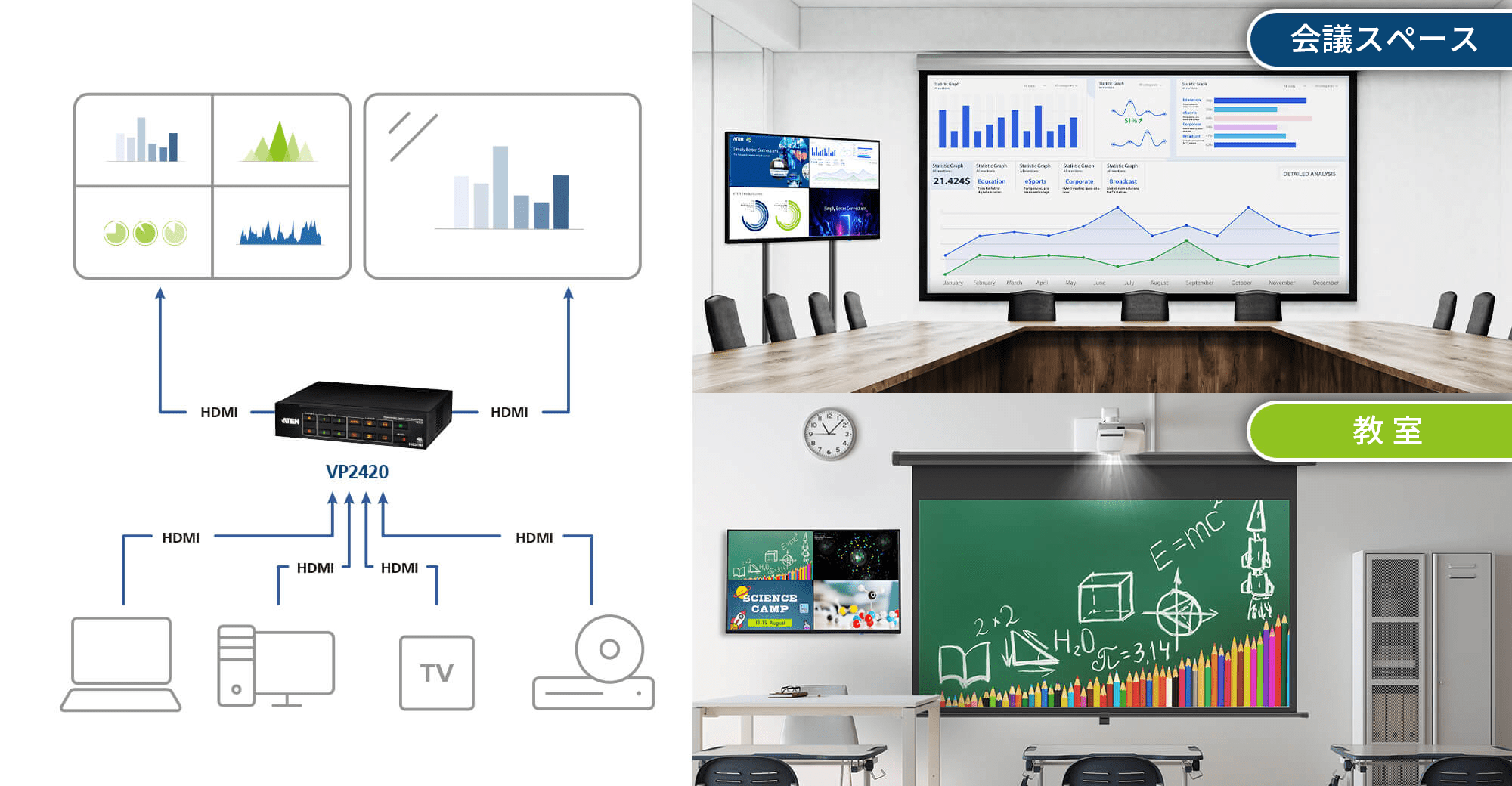VP2420は、4K60p解像度とマルチビュー表示に対応した4入力2出力HDMIプレゼンスイッチャーです。複数のソースをスムーズに切り替え、2画面を使って複数レイアウトで映像を出力することができます。会議室における複数画面を使用した情報分析や、ビデオウォールを使ったモニタリングなどで活用することで、シームレスなチーム連携と効率的な意思決定を実現します。