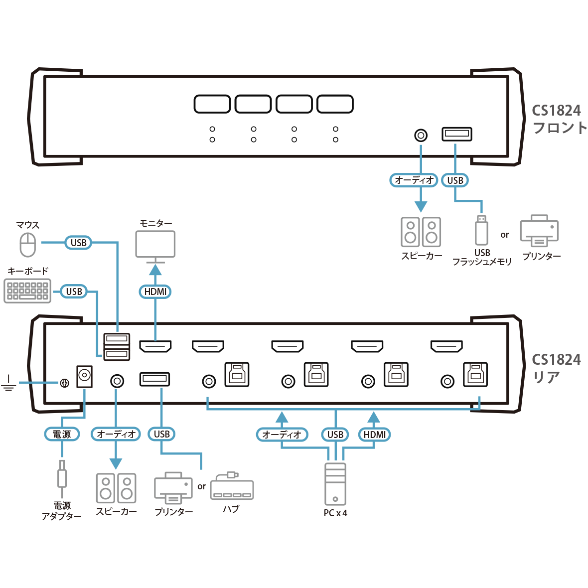 - 1組のコンソール(USBキーボード/USBマウス/HDMIモニター各1台)から、コンピューター2台(CS1822)/ 4台(CS1824)の操作とUSB周辺機器の共有が可能