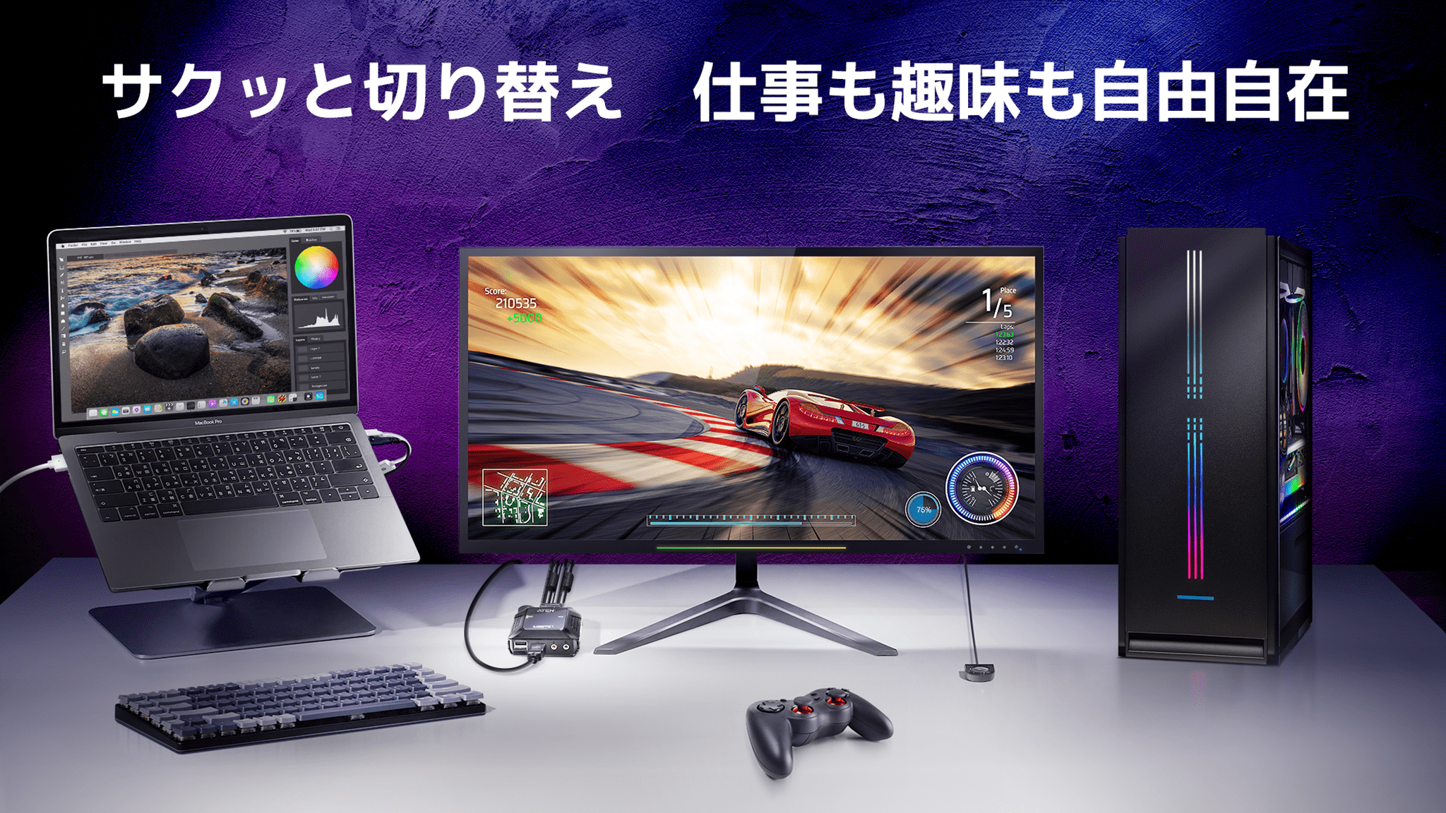 - 1組のUSBキーボード/マウス、および1台のHDMIモニターを使って、2台のHDMIコンピューターを制御