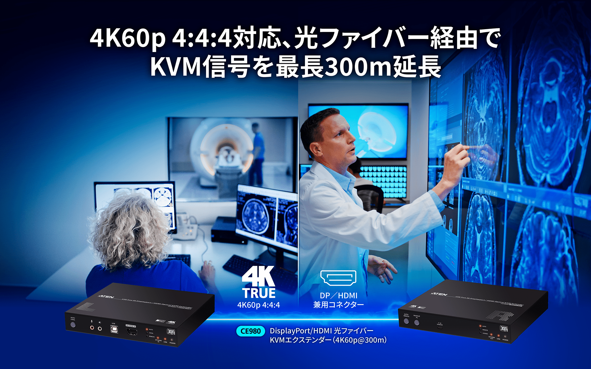 CE980は、USB対応のDisplayPort/HDMI光KVMエクステンダーです。光ファイバー経由でKVM信号を最大300mまで延長でき、HDCP 2.3に準拠した4K60p 4:4:4の映像を伝送します。DisplayPortまたはHDMIに対応したコンボコネクターを採用し、ローカル・リモート両側で映像出力を選択できるため、設置も簡単です。高精細な映像に加えて、RS-232、USB 2.0周辺機器、DisplayPort/HDMIのデジタル音声(Dolby TrueHD、Dolby Digital Plus、DTS-HD Master Audio)にも対応し、1本の光ファイバーで多彩な信号を延長できます。CE980は、医療、映像編集、製造現場など、重要な制御環境に最適な製品です。