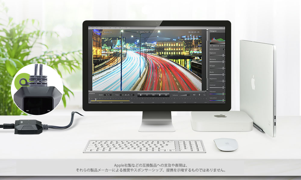 - 1台のKVMスイッチで、1組のキーボード、マウス、モニターから2台のUSB-Cデバイスの簡単操作と高速切替が可能