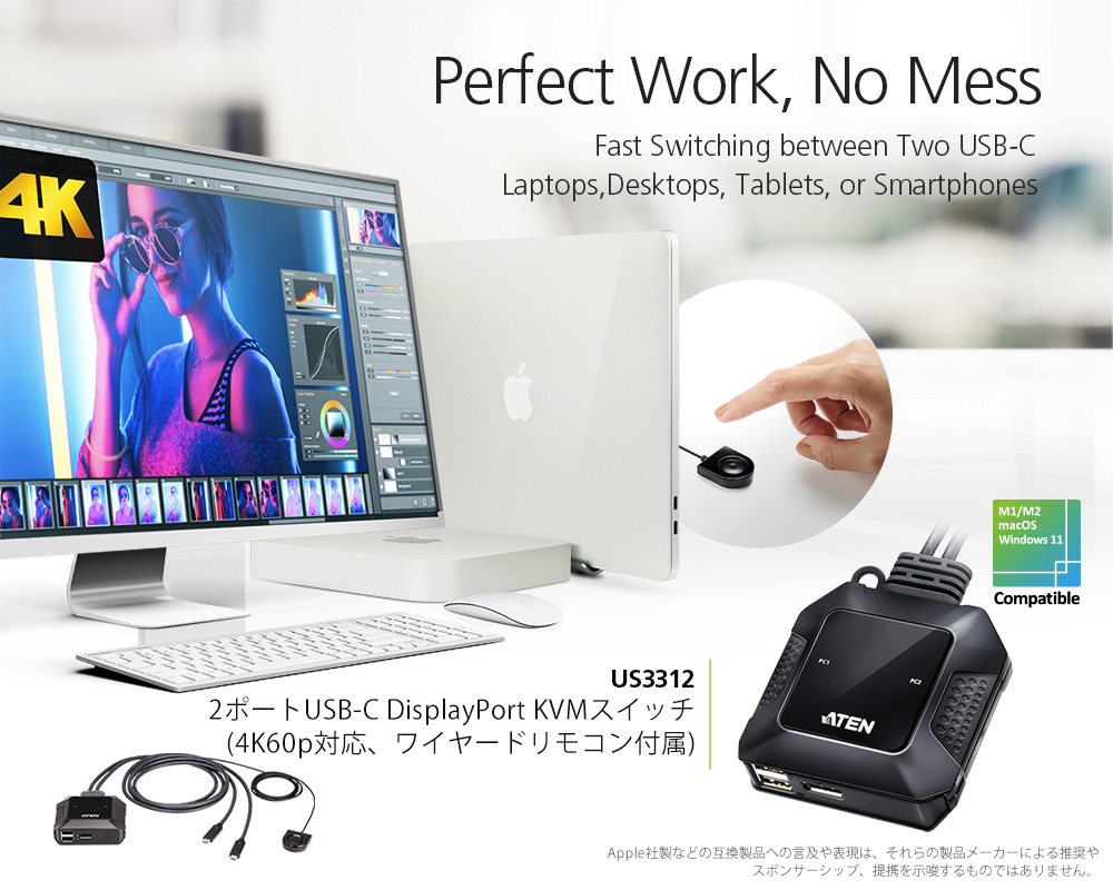 コンパクトなUS3312は、ケーブルKVMスイッチのパワーとUSB-C接続のモビリティでワークスペースを刷新し、ハイブリッドワークの課題に正面から取り組むのに最適です。ボタンを押すだけで、ノートパソコン、タブレット、MacBook、iPad、さらにはMac miniなど、2台のUSB-CモバイルデバイスのタスクをDisplayPortとUSBコンソールから3秒で素早く切替え、最も複雑なワークフローを合理化します。US3312は、魔法のようにデスクトップのワークスペースをすっきりさせ、スペース効率の良い新しい外観を実現し、鮮やかな4K表示品質をもたらし、ワークパフォーマンスを向上させることができます。