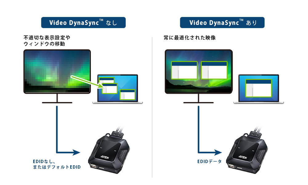 ATENの特許技術であるVideo DynaSync ™ は、すべてのOSでポート間の切替え時に正しい解像度とディスプレイ構成を維持し、起動時のディスプレイの問題を解消し、スムーズなデスクトップ操作を実現します。