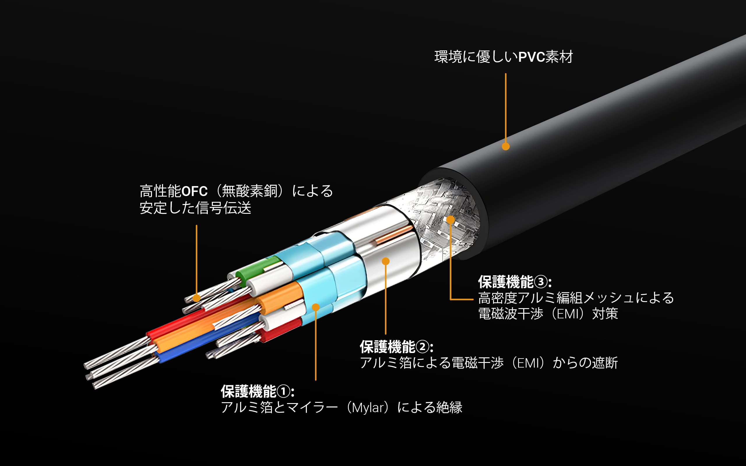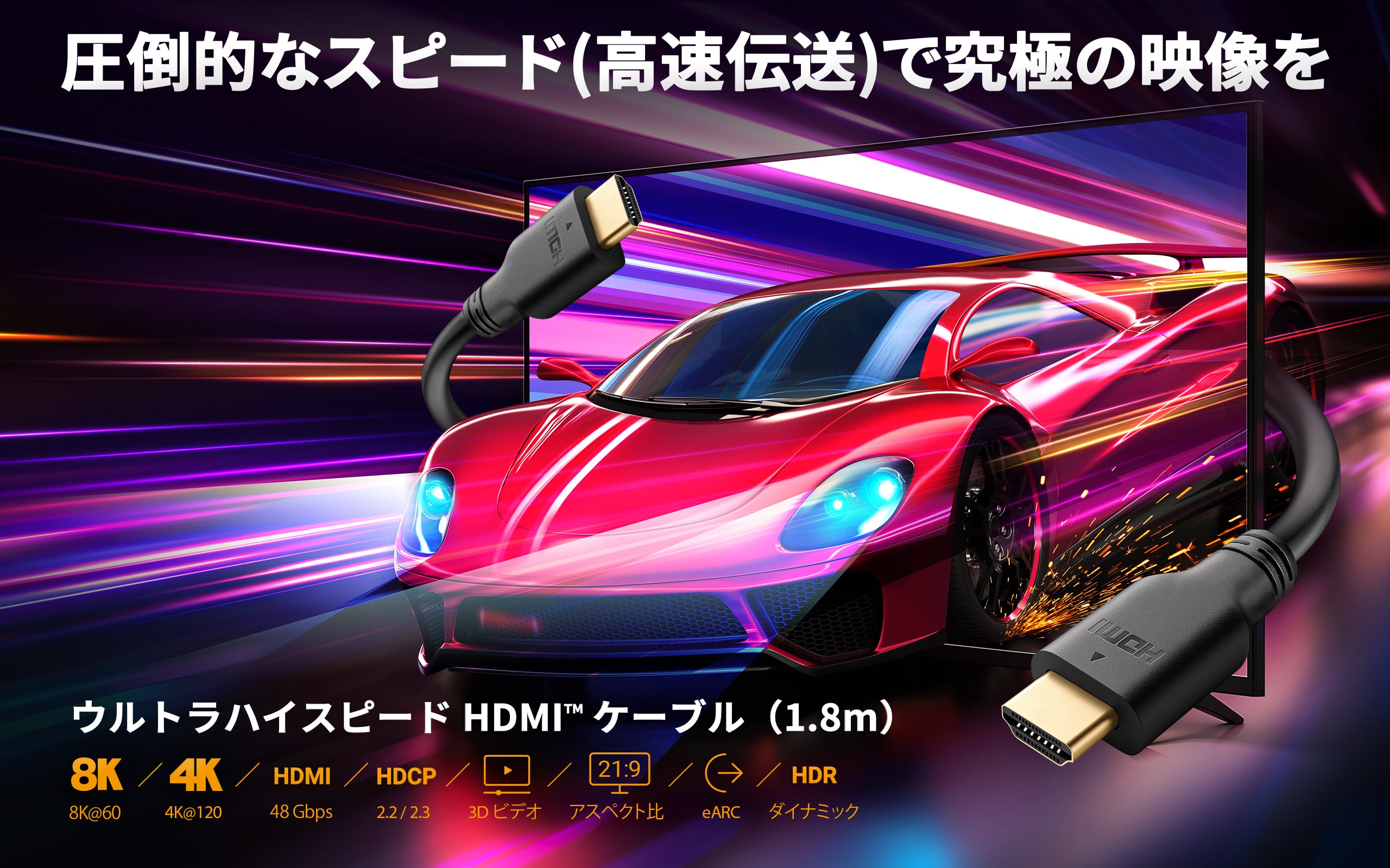 ウルトラハイスピードHDMIケーブルは48 Gbpsで映像のちらつきや残像のない繊細な8K映像を伝送します。