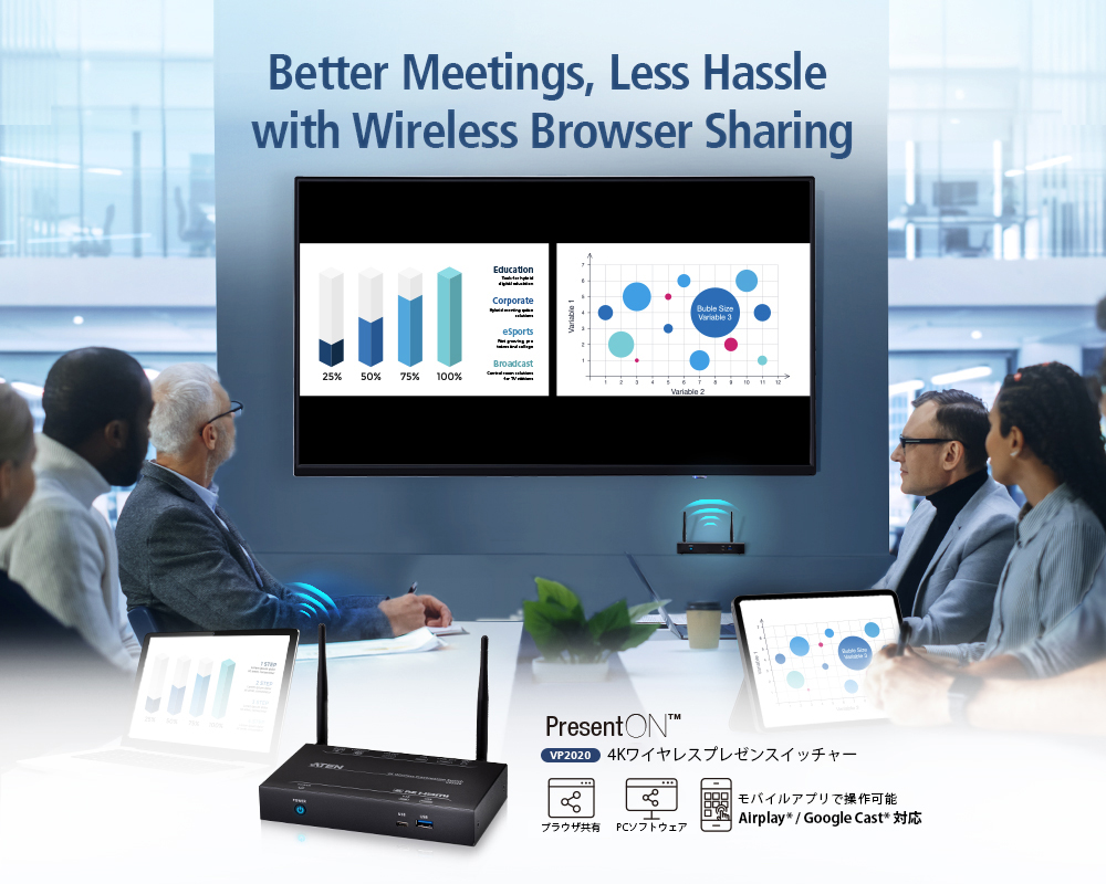 ATEN PresentON™ VP2020は、ノートPCまたはモバイルデバイスから簡単にコンテンツを共有できるワイヤレスBYODソリューションです。本製品により、会議の場にいる人々が積極的に連携できるようになり、ワークフローの効率改善・強化が期待できます。 VP2020は、コンテンツ共有が自由に行えるよう設計されたマルチビューとオーディオ出力が特長です。また、USBのタッチバック機能や司会モード機能を活用することで、プレゼンターは会議を簡単にコントロールすることができます。さらに、PoE対応のため、セットアップが容易に行えます。本製品は、小さなミーティングスペースと大会議室の両方に適しており、企業や教育での使用に十分な柔軟性を備えています。