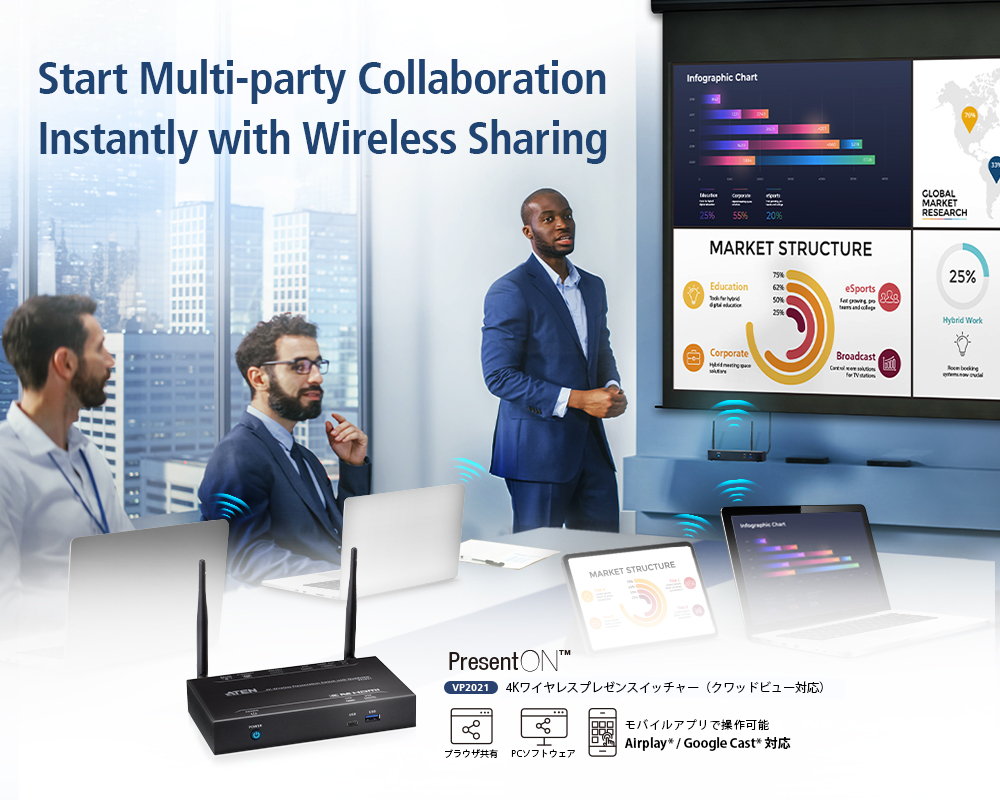 ATEN PresentON™ VP2021 は、ノートPCやモバイルデバイスからコンテンツを簡単に共有できるワイヤレスBYODソリューションです。本製品により、会議の場にいる人々が積極的に連携できるようになり、ワークフローの効率改善・強化が期待できます。 VP2021は、コンテンツ共有が自由に行えるよう設計されたマルチビューとオーディオ出力が特長です。また、USBのタッチバック機能や司会モード機能を活用することで、プレゼンターは会議を簡単にコントロールすることができます。VP2021には、チームの生産性向上につながる革新的な連携ツールもあります。また、すべての参加者がプレゼンに集中できる「リモートビュー」も、本ソリューションの特長の一つです。さらに、PoE対応のため、セットアップが容易に行えます。本製品は、小さなミーティングスペースと大会議室の両方に適しており、企業や教育での使用に十分な柔軟性を備えています。